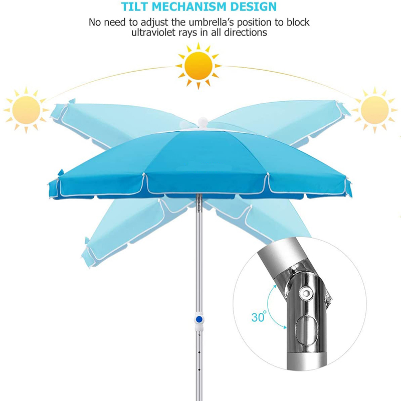 এই সৈকত ছাতার টিল্ট অ্যাডজাস্টমেন্ট ফাংশনটি আপনাকে সূর্যের কোণ অনুসারে ছাতার পৃষ্ঠটিকে নমনীয়ভাবে সামঞ্জস্য করতে দেয়, নিশ্চিত করে যে আপনি যে কোনও সময় এবং যে কোনও পরিবেশে সানশেড প্রভাব উপভোগ করতে পারবেন এবং প্রতিফলিত সূর্যের আলো সরাসরি আপনার চোখে আঘাত করে এড়াতে পারবেন।